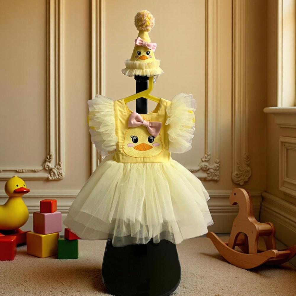 فستان بطة أصفر للبنوتات بتصميم مميز ومرح، مثالي لأعياد الميلاد والحفلات. يتميز بتطريز وجه بطة لطيف مع كشكش تول ناعم يمنح الفستان لمسة أنثوية وملوكية. يأتي مع قبعة حفلة مطابقة تضيف لمسة احتفالية مثالية للتصوير والمناسبات الخاصة.
