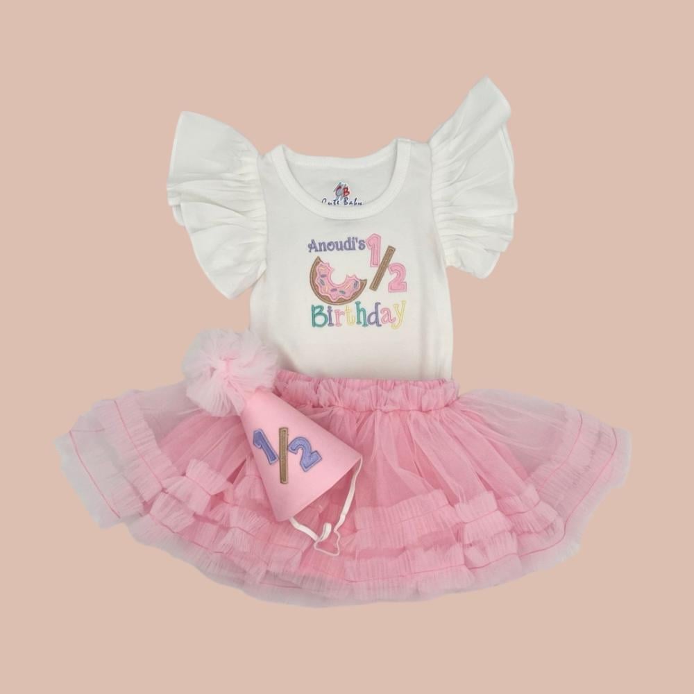 طقم بودي سوت أبيض بناتي مع قبعة مصمم خصيصًا للاحتفال بمناسبة نصف السنة، يتميز بلمسات أنيقة ومرحة لإطلالة لا تُنسى.