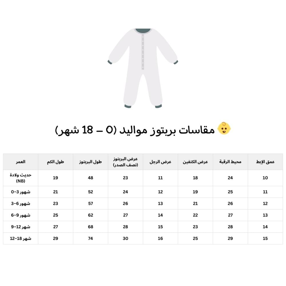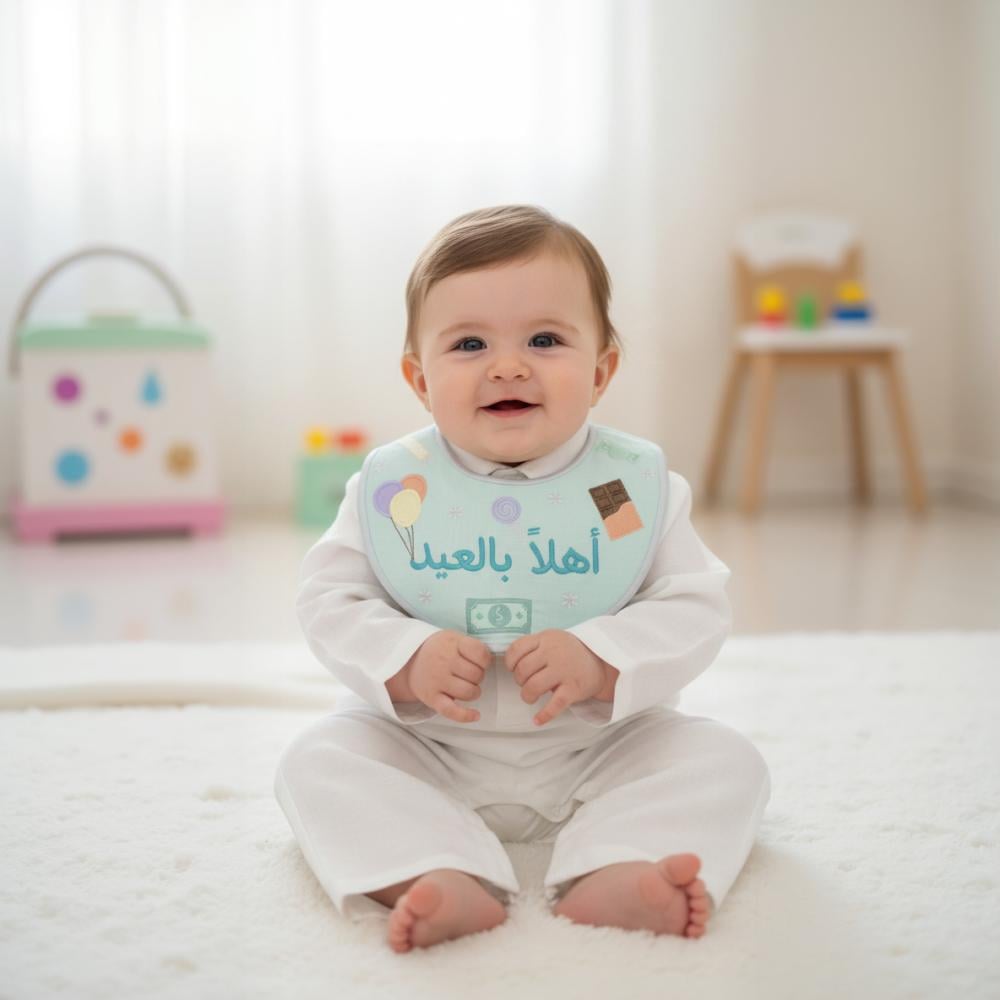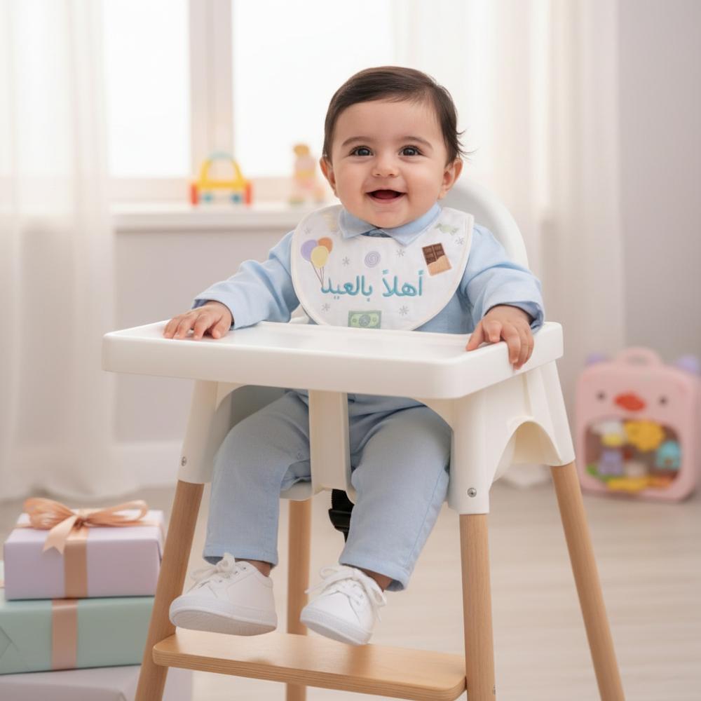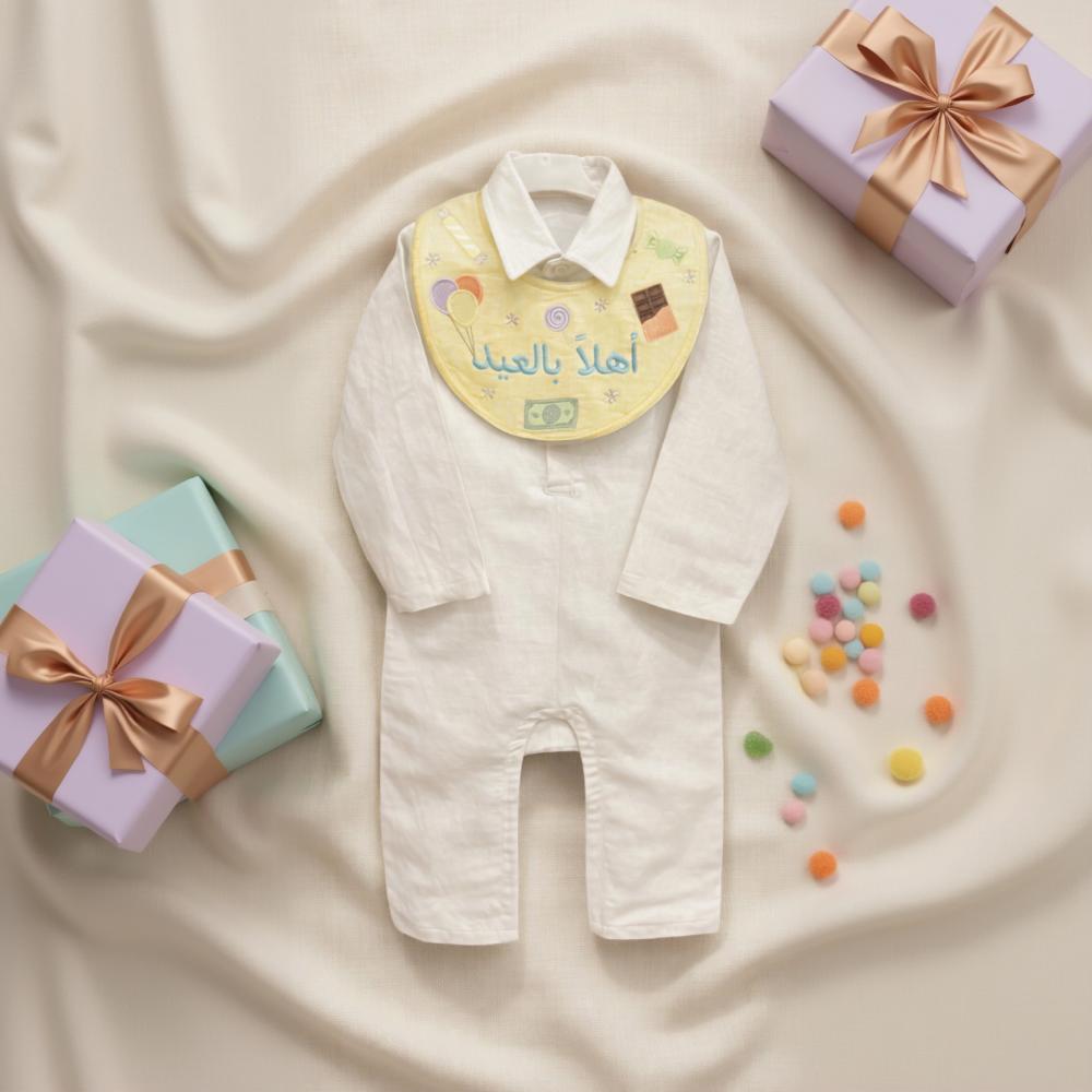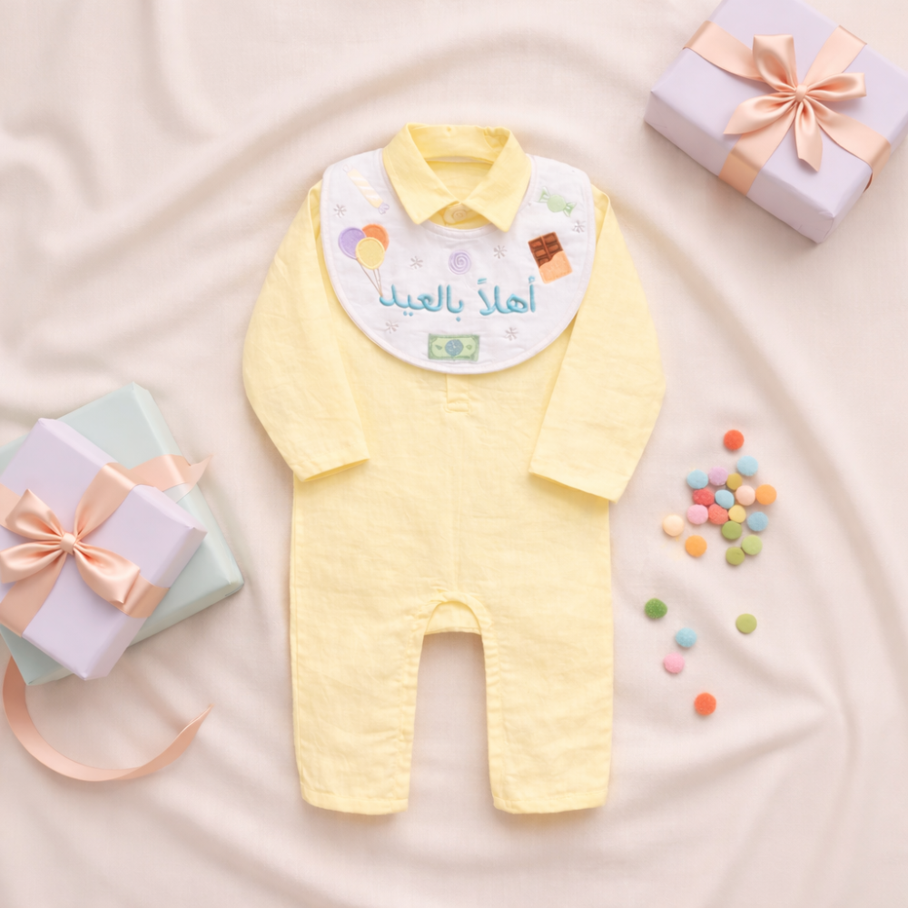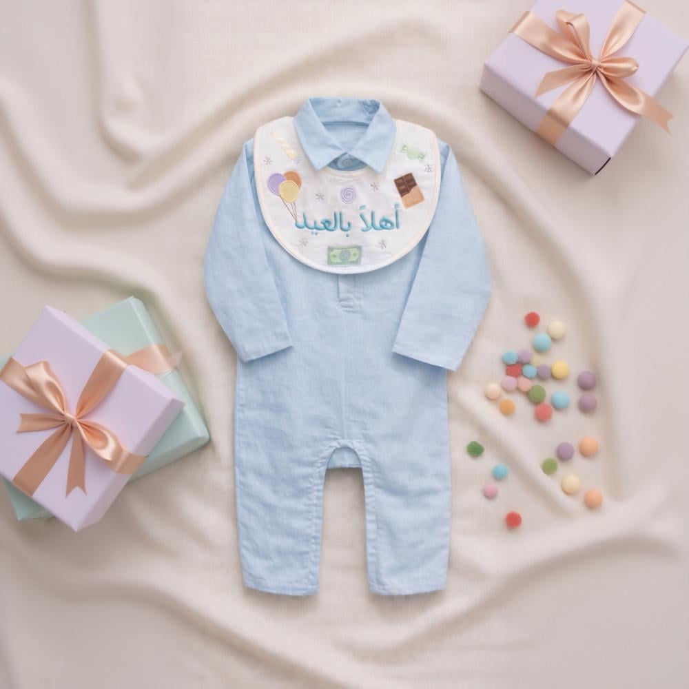 يأتي البربتوز بقماش لينن خفيف ومريح على البشرة، مع مريلة مطرزة بعبارة “أهلاً بالعيد” وتفاصيل رسومات العيد المبهجة من حلويات وبالونات بلمسة طفولية راقية.