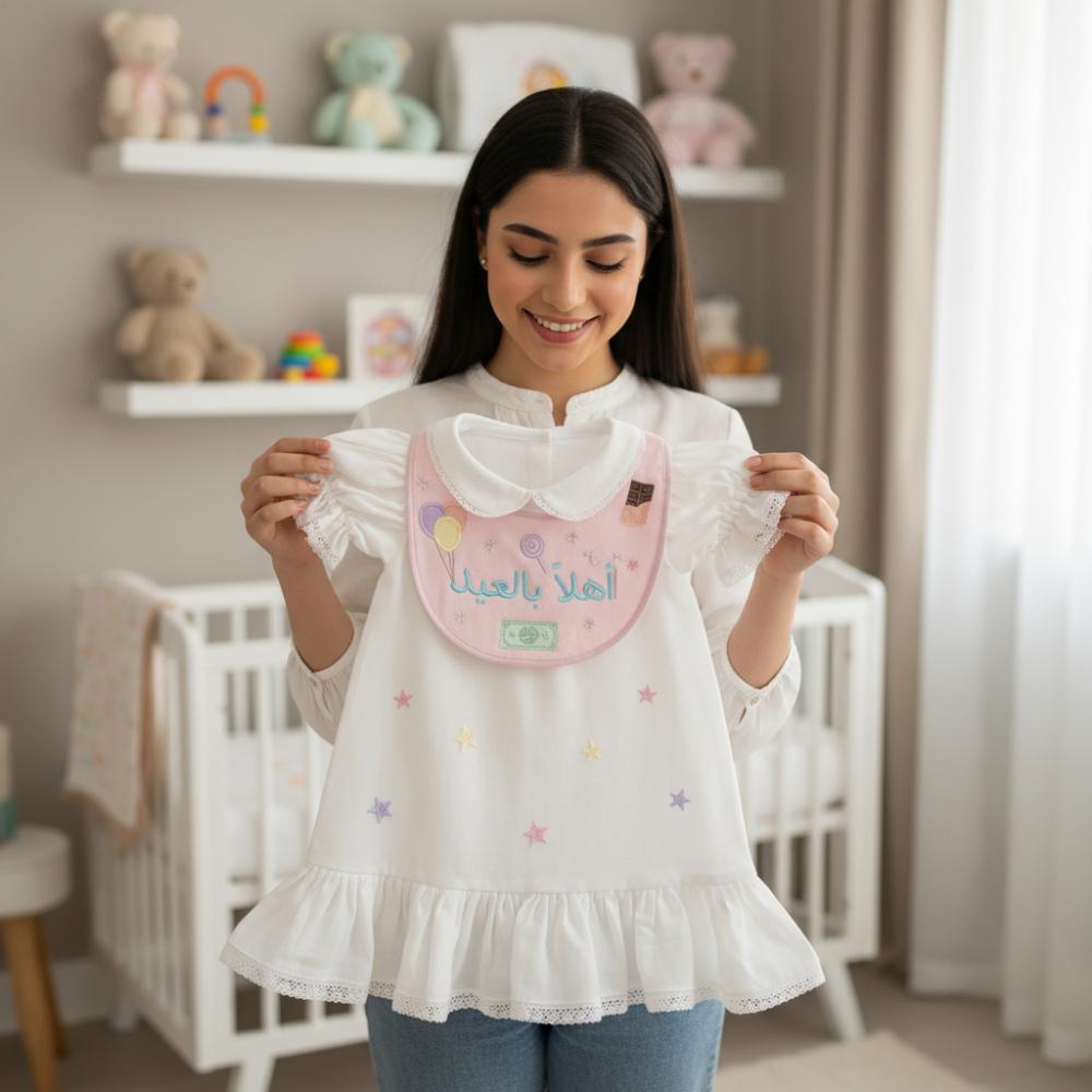 يكتمل التصميم بـ مريلة مطرزة بعبارة "أهلاً بالعيد" مع رسومات عيدية مرحة مستوحاة من أجواء الفرح والحلوى، لتكون القطعة مثالية لصور العيد وأول إطلالة احتفالية لطفلتك.