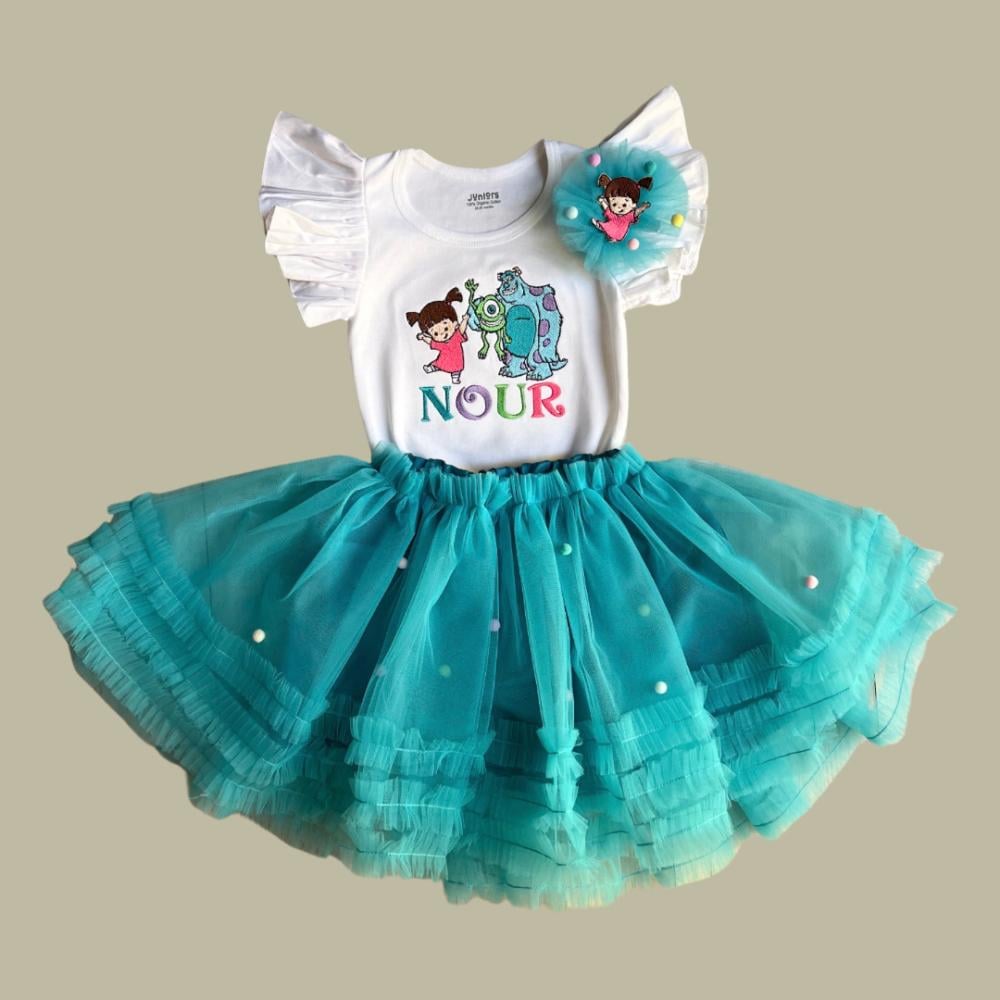 طقم للبنات بشخصيات شركة المرعبين يتكون من بودي سوت بكم كرانيش و تنورة توتو مزينة بكور pom pom ملونة
