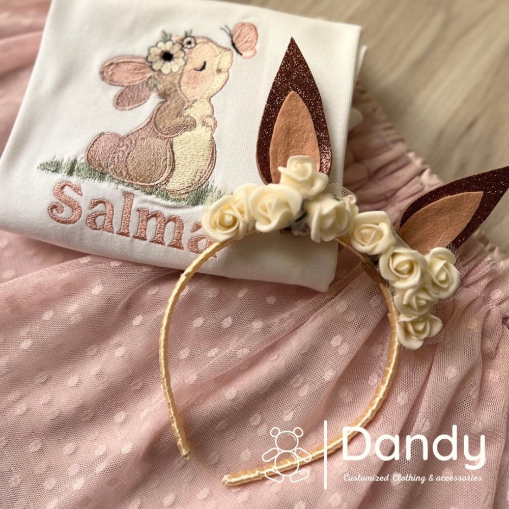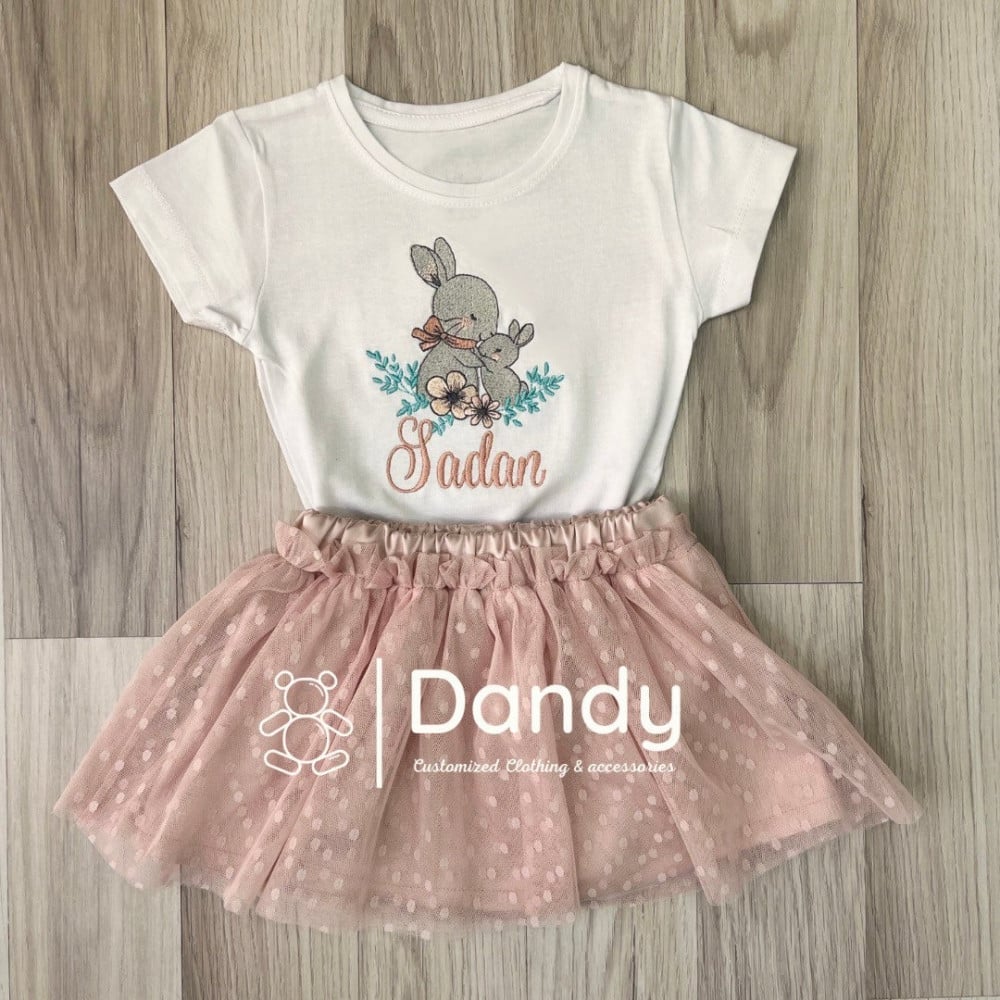 طقم مكون من بودي سوت/ تيشيرت مع تنورة من التل المنقط باللون الزهري الفاتح .. متوفر من عمر 6 شهور إلى 6 سنوات