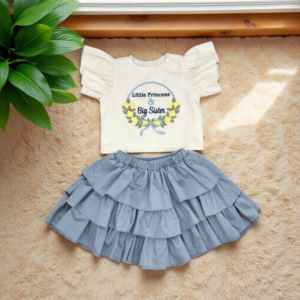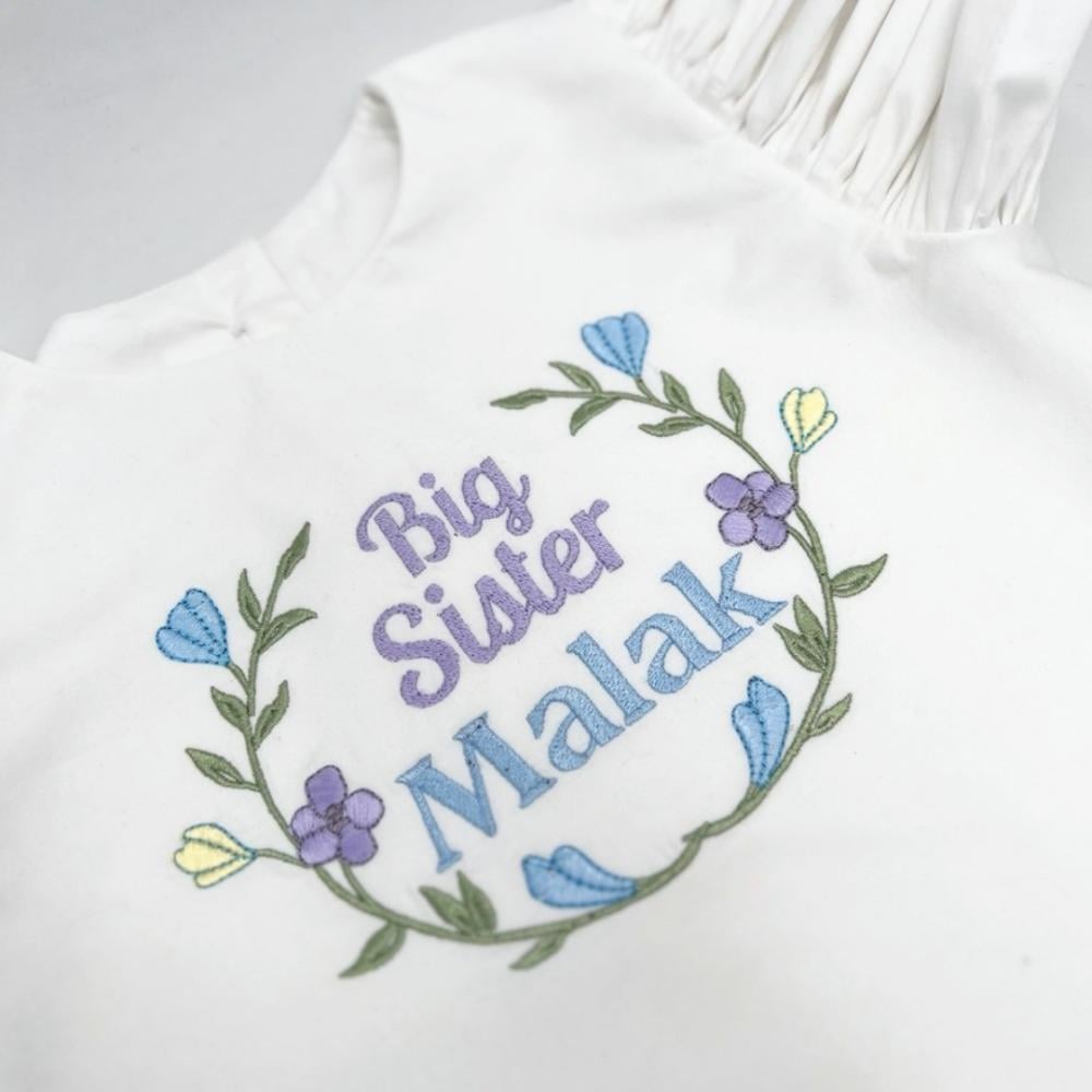 طقم مميز للأخت الكبيرة بتصميم أنيق ولمسة مليئة بالحب، مكوّن من بلوزة قطنية باللون الأبيض مطرزة بجملة " Big Sister" ، مع أكمام كرانيش عريضة تضيف لمسة رقيقة وناعمة. يأتي معها تنورة طبقات باللون الأزرق بتصميم كشكش يعطي إطلالة حيوية مرحة تناسب الاحتفالات والمناسبات الخاصة.