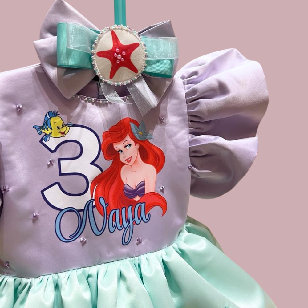 يأتي الفستان بلون بنفسجي فاتح للصدر مع أكمام كشكش أنثوية، و من الأسفل باللون التركواز مزين برسومات أرييل، فلوندر، ونجمات البحر لإضفاء أجواء بحرية ساحرة.