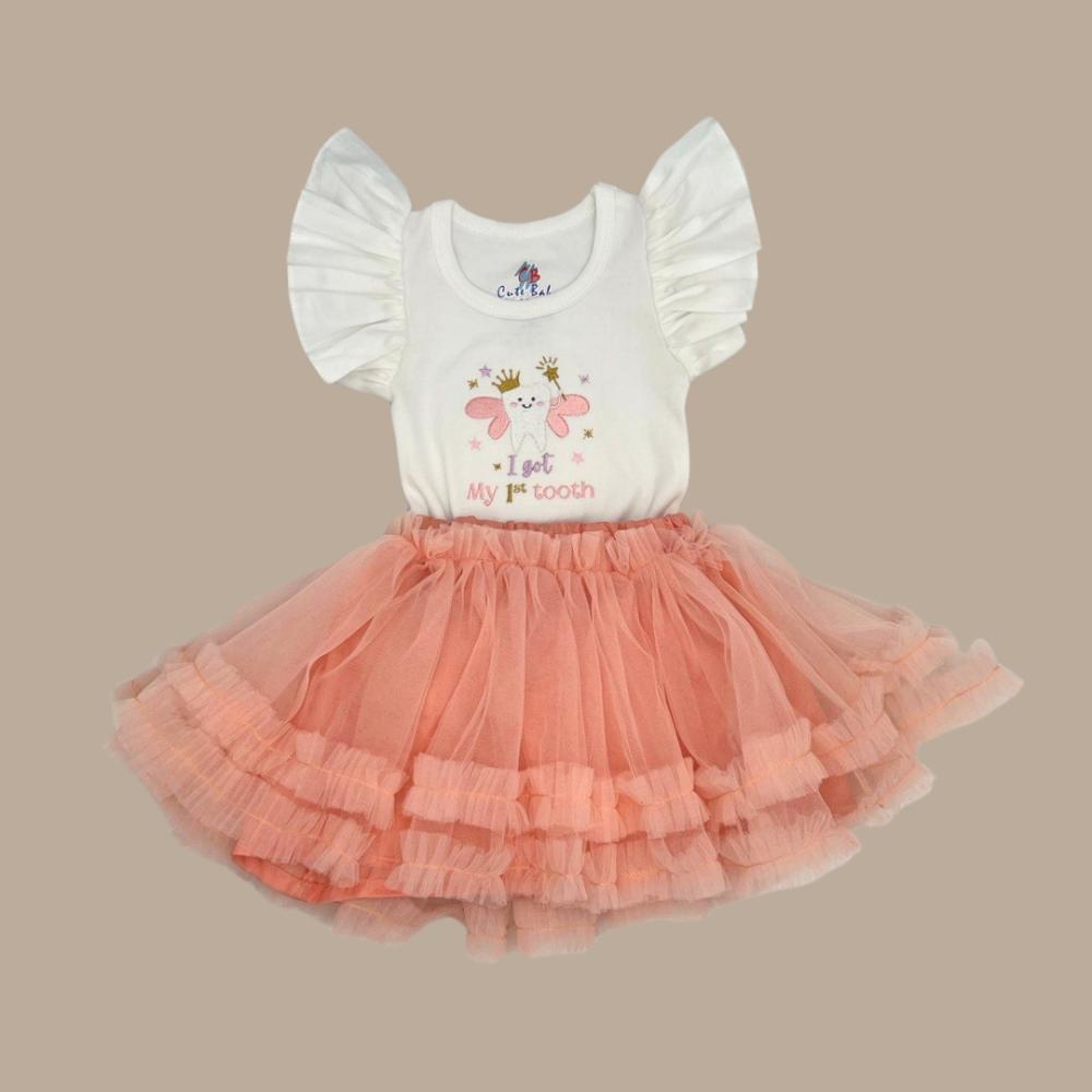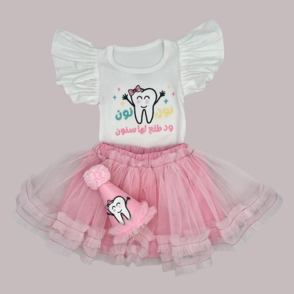 طقم "أول سن" البناتي المثالي للاحتفال بهذه اللحظة الخاصة! يتميز بتصميم أنيق ولطيف، متوفر للأطفال من عمر 6 شهور إلى سنة. يتكون الطقم من:
