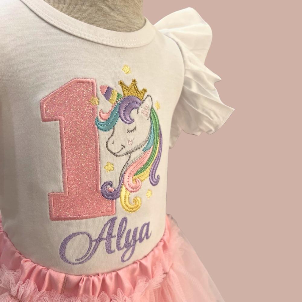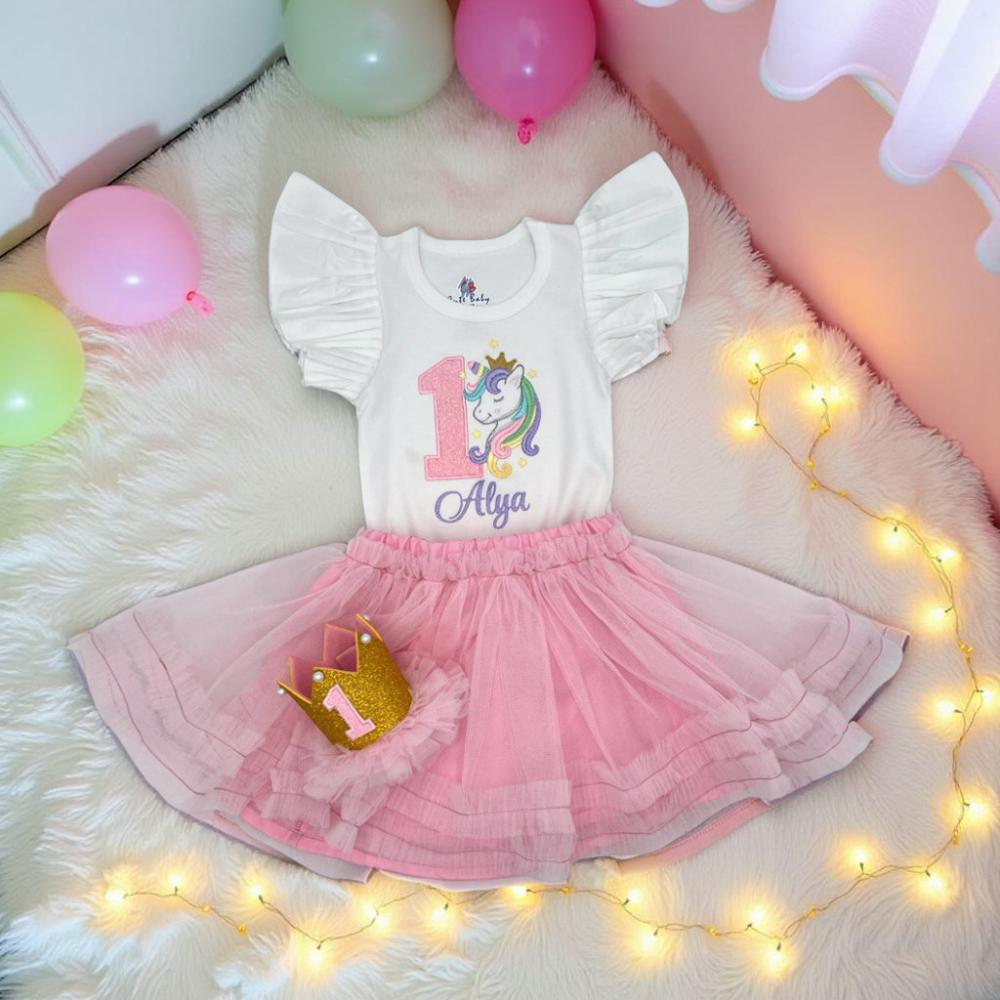 احتفلي بعيد ميلاد صغيرتك مع هذا البودي سوت العملي بطقطق من الأسفل لسهولة اللبس والتغيير. يتميز بتصميم مطبوع باسم طفلتك وعمرها بألوان يونيكورن براقة، مع تنورة تول وردية منفوشة تضيف لمسة من الأناقة والبراءة. ويكتمل الطقم بتاج ذهبي أنيق مزين بارقم حسب عمرها ليجعلها نجمة الحفل.