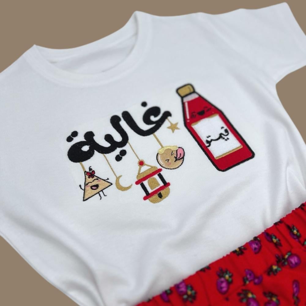 طقم بناتي أنيق ومميز يناسب الفتيات من عمر شهر حتى 14 سنة. يتكون الطقم من تنورة رائعة مصممة بكرانيش أنيقة من الأسفل بنقشة الشالكي الجذابة، تضيف لمسة من المرح والجمال. يرافقها تيشيرت قطن أبيض ناعم وعالي الجودة، مزين برسومات شخصيات رمضانية مرحة، لتضفي جوًا من البهجة والاحتفال بأجواء الشهر الكريم.