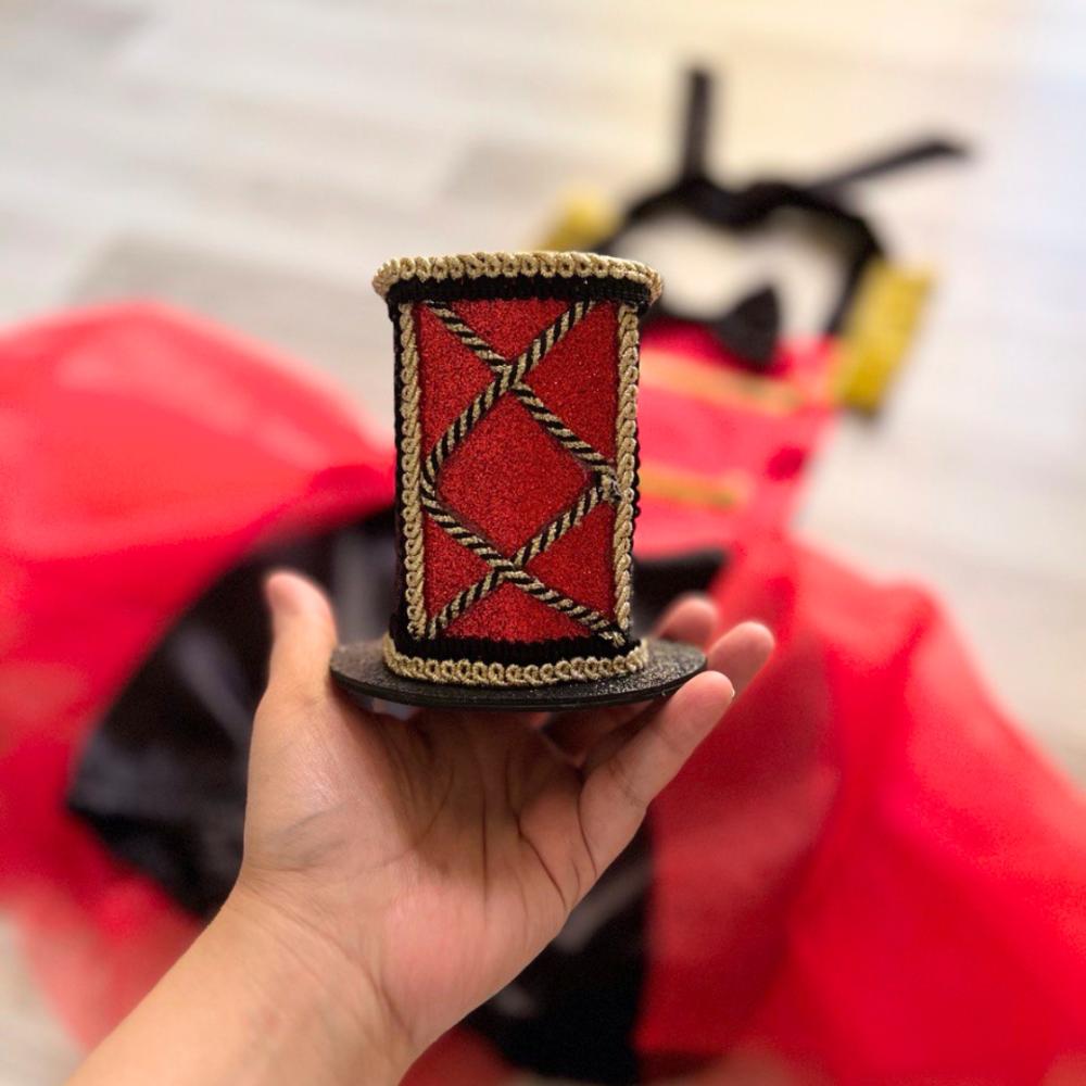 البدلة مكونة من رومبر و قبعة باللون الأحمر و الأسود بقماش الستان الفاخر و الذيل بطبقات التل الأحمر
