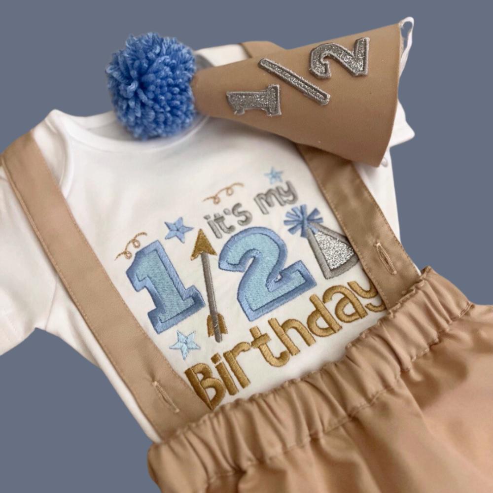 طقم ولادي أنيق ومميز مصمم خصيصًا للاحتفال بعيد ميلاد نصف السنة. يتكون من ثلاث قطع: